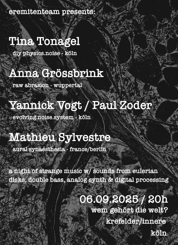 Ich erforsche timbrale Mikrostrukturen analoger Synthesizer. Mein Weg führt mich über harmonische Räume als Instrumentalist hin zu abstrakten Geräuschen, in denen die Materialität der spannungsgesteuerten Instrumente zur Sprache kommt. Resonante Filter, unquantisierte Oszillatoren und polyrhythmische Sequencer bilden den Kern meines Klangs, der durch den sparsamen Einsatz von Effekten transparent erkennbar bleiben soll.